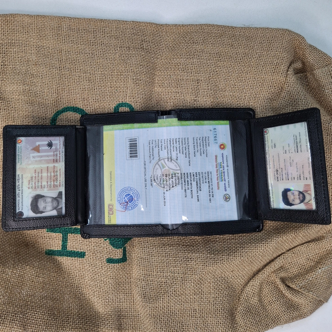 ৬. ৩টি ট্রান্সপারেন্ট (সচ্ছ) পকেট (ড্রাইভিং লাইসেন্স, রেজিস্ট্রেশন কার্ড ও ট্যাক্স টোকেন রাখার জন্য)